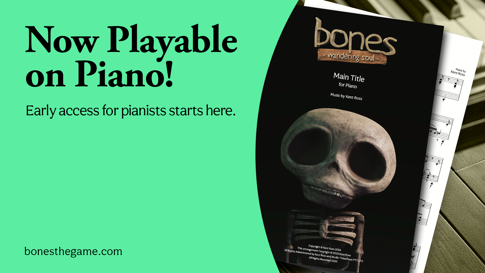 This vibrant piano piece marks the journey of Bones and is the first of many original compositions written by composer Kent Ross for our debut game. Whether you’re a pianist, a music lover, or simply enjoy connecting with game worlds through music, this score offers a new way to experience Bones beyond the screen.
